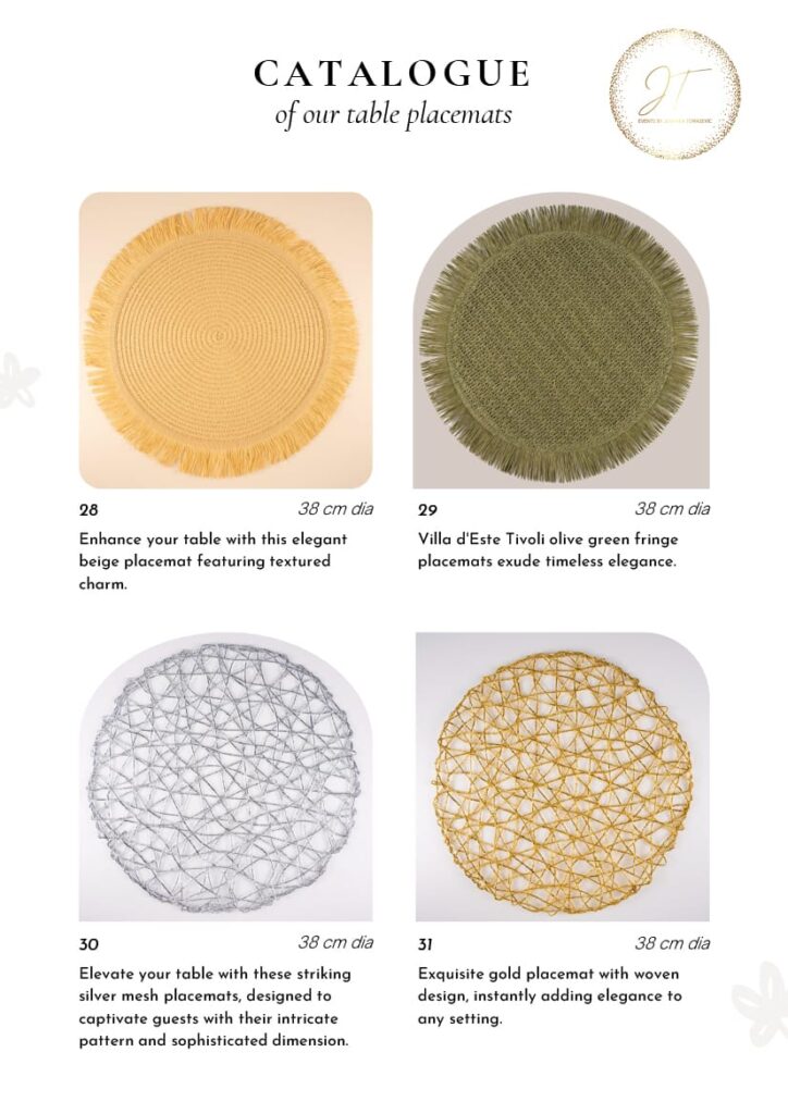Renting luxury placemats from JT Events is a seamless experience. We handle all aspects of delivery, setup, and collection, so you don’t have to worry about a thing. Our team ensures that all rentals are in pristine condition and that the placemats are delivered on time to create a stress-free planning process for you.